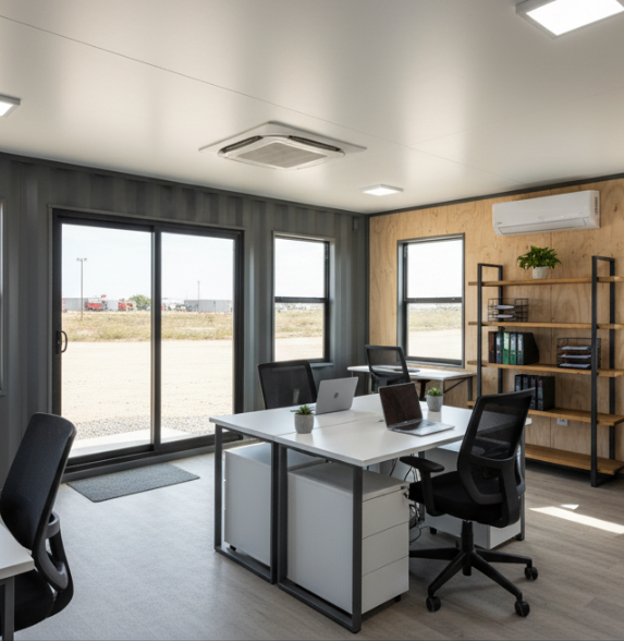 Choose from insulated walls, AC, windows, office furniture, and storage for a tailored, functional workspace.